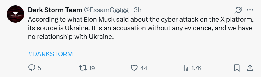当地时间3月10日,社交媒体平台X出现故障,马斯克称X受到大规模网络攻击,“IP源头是乌克兰”。3月11日,黑客组织Dark Storm Team在社交媒体上暗示对X平台遭受攻击负责,并表示:“马斯克的指控没有任何证据,我们与乌克兰没有任何关系。”据悉,Dark Storm Team是一家亲巴勒斯坦的黑客组织。