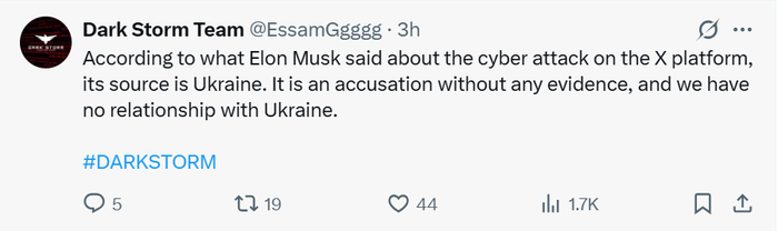 3月11日,黑客组织Dark Storm Team在社交媒体上暗示对X平台遭受攻击负责,并表示:“马斯克的指控没有任何证据,我们与乌克兰没有任何关系。”据悉,Dark Storm Team是一家亲巴勒斯坦的黑客组织。