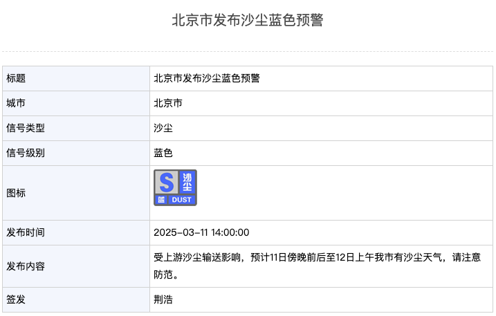 北京市发布沙尘蓝色预警:受上游沙尘输送影响,预计3月11日傍晚前后至12日上午北京市有沙尘天气,请注意防范。