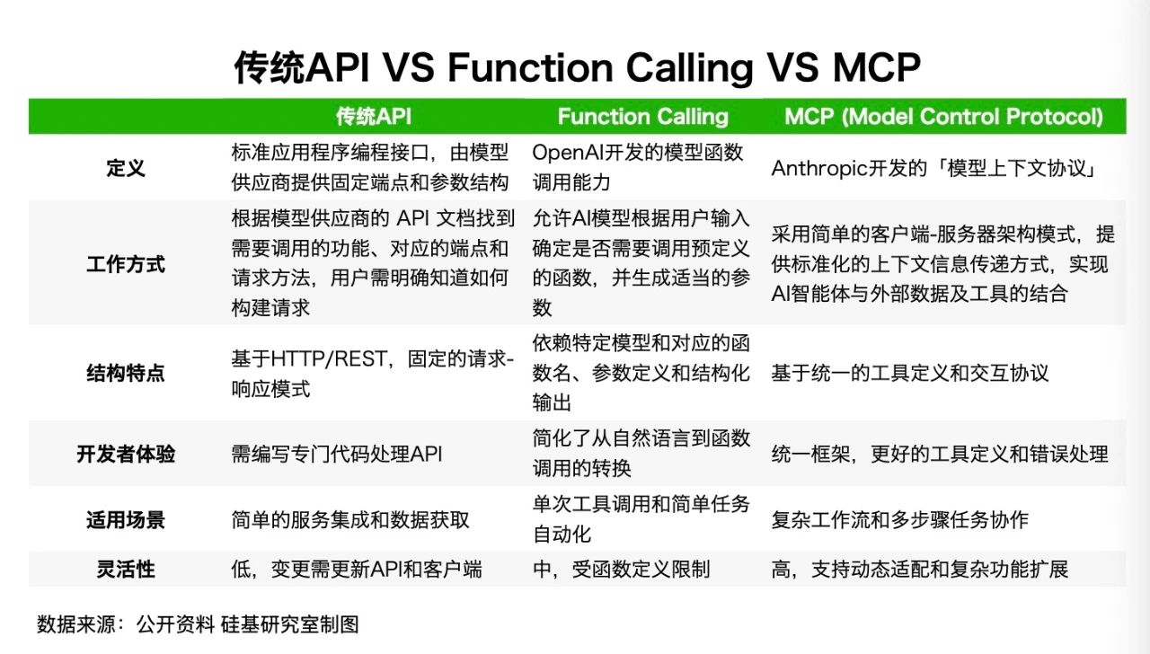 「MCP」比Function Calling多走了一步——提供了一套API的调用标准,通过标准化框架确保生成的函数调用在不同的系统中一致有效地执行,用一个标准试图取代过去碎片化的集成方式。