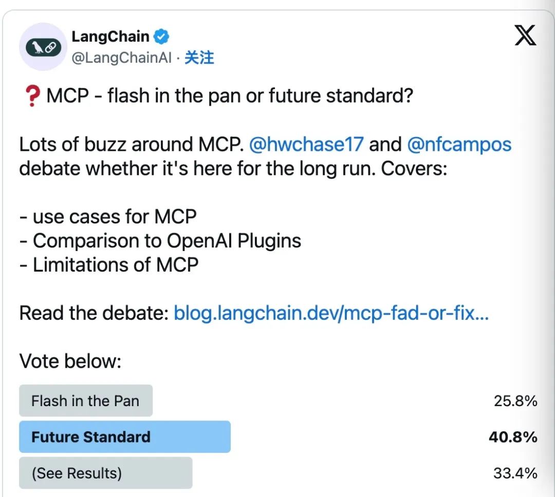 LangChain还发起了一个「MCP是昙花一现还是未来标准」的投票,图源:官方博客