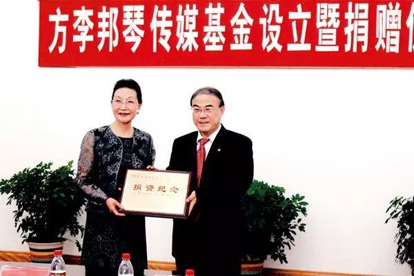 ▲方李邦琴为武汉大学捐款设立媒体基金,并在捐赠仪式上与武汉大学校长刘经南合影