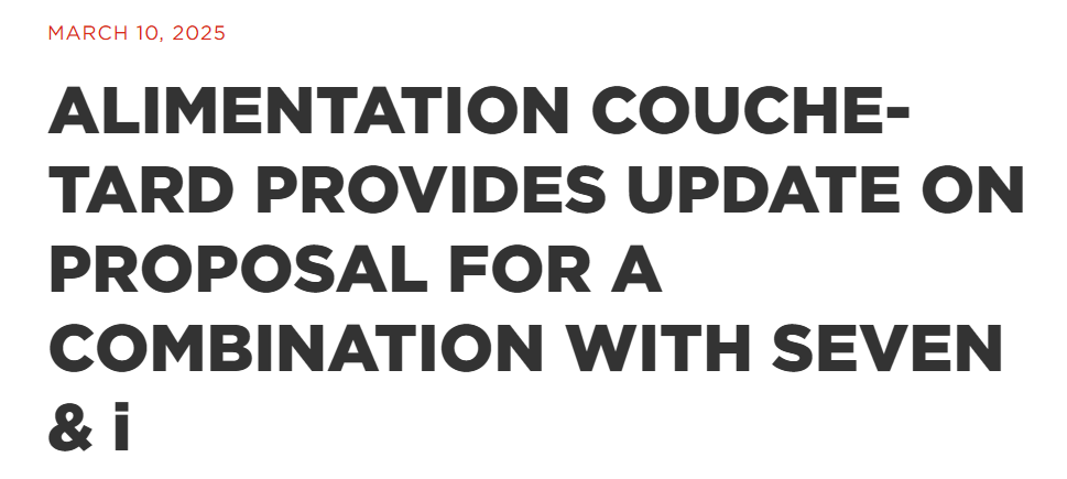 加拿大便利店巨头Alimentation Couche-Tard(ACT)当地时间3月10日发布声明,重申将以“友好而坚持的态度”寻求收购7-11便利店母公司柒和伊控股。声明提到,应柒和伊控股的要求,ACT在今年1月提交以日元计价、不具约束力的修改后收购提案,但未透露具体金额。