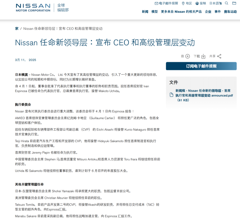 此外,日产还对其执行委员会进行多项人事调整,包括AMIEO首席绩效官兼管理委员会主席、车辆规划和车辆零部件工程部公司副总裁、汽车生产工程和开发部的副总裁等人,该委员会将于4月1日向新晋CEO伊万·埃斯皮诺萨报告。