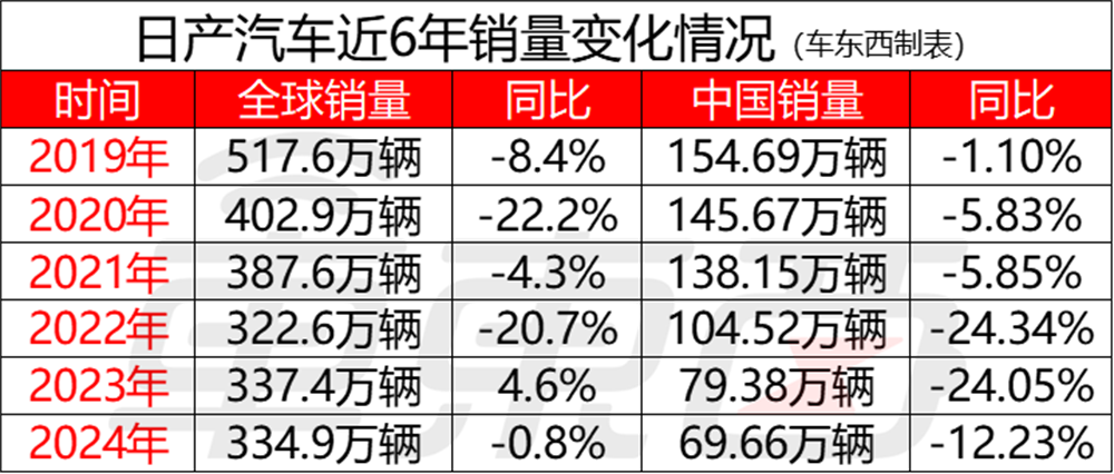 但6年过后,一系列计划的执行效果并未完全达到预期,中国市场销量逐年下滑,跌至腰斩,日产全年盈利预测已多次下调,且尚未实现业绩的根本性改善,与本田的业务合并谈判也未能达成协议。