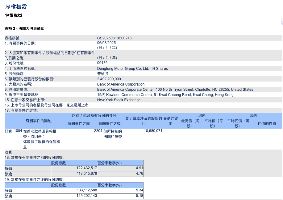 3月11日,据港交所权益披露,美国银行在东风集团股份的持股比例于3月6日从4.91%升至5.34%。