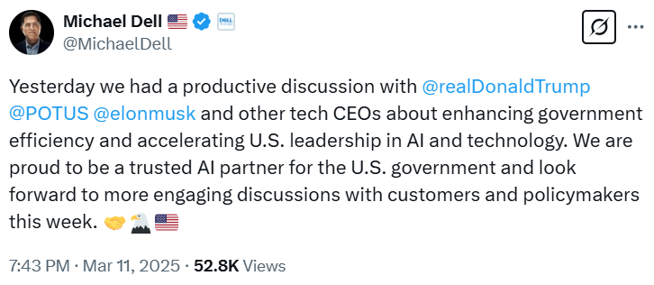 戴尔科技董事长兼CEO迈克尔·戴尔(Michael Dell)3月11日在社交媒体平台X发文称,昨日同美国总统特朗普、马斯克和其他多家科技公司高管洽谈,“讨论提高政府效率和加速美国在人工智能与科技领域的领导地位”。戴尔称,本周将与决策者和客户开展更多“积极讨论”。