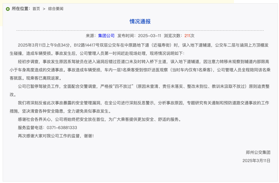 3月11日上午,郑州B12路14417号双层公交车在中原路地下道(近福寿街)时,误入地下道辅道,公交车二层与涵洞上方顶棚发生碰撞,造成车辆受损。郑州公交集团发布情况通报称,经初步调查,事故发生原因系驾驶员在进入涵洞后错过匝道口未及时转入桥下主道,误入地下道辅道,因注意力转移未观察到辅道内部限高小于车身高度造成的交通事故。事故造成车辆受损,车内一层1名乘客受到惊吓送医观察(当时车内仅有1名乘客),公司管理人员全程陪同该名乘客就医。现乘客已离院返家。公司已暂停驾驶员工作,全面配合交警调查,严格按“四不放过”(原因未查清、责任未落实、整改未到位、教训未汲取不放过)原则追责整改。