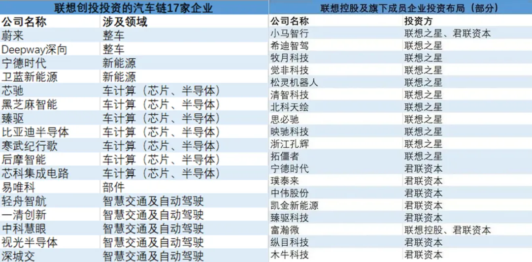 而在乘用车市场,2022年联想集团那份《汽车产业布局手册》中的被投企业名单,或许还有一些含金量。