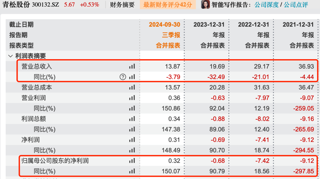 经历了接连3年的亏损之后,2024年青松股份的业绩状况有所好转。
