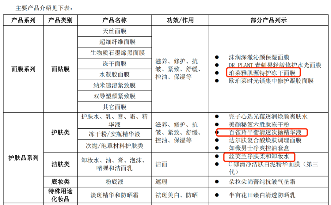 诺斯贝尔曾以“中国最大面膜代工厂”自居。例如,珀莱雅肌源特护冻干面膜、百雀羚平衡清透次抛精华液、丝芙兰净肤柔和卸妆水都是诺斯贝尔代工生产。