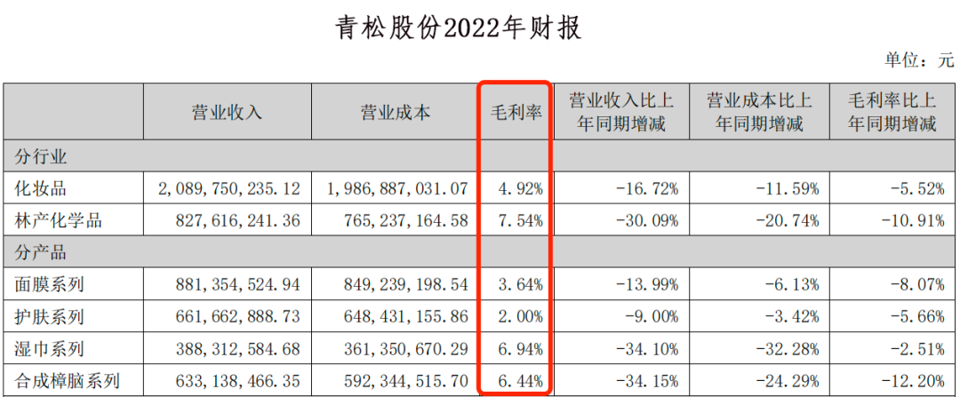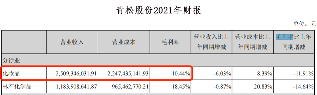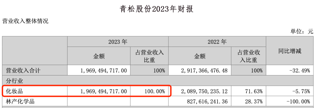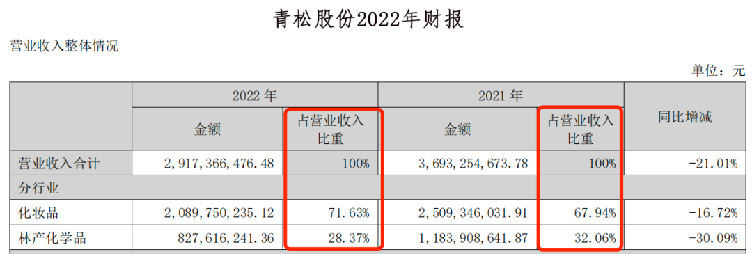 2021年和2022年,公司化妆品业务占营业收入的比例分别为67.94%和71.63%。到了2023年,化妆品业务已经成为青松股份的主要经营业务,并且彻底放弃了松节油等林产化学品业务。