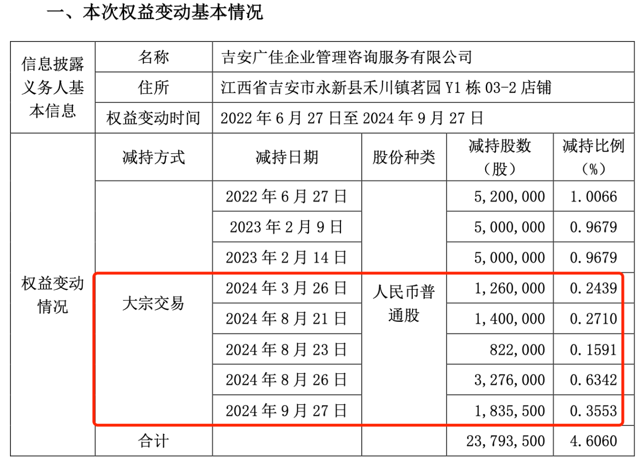 2024年10月8日,青松股份发布公告显示,2022年6月27日至2024年9月27日,持股5%以上的股东吉安广佳通过大宗交易方式,累计减持公司无限售流通股共2379.35万股,约占公司总股本的4.61%。