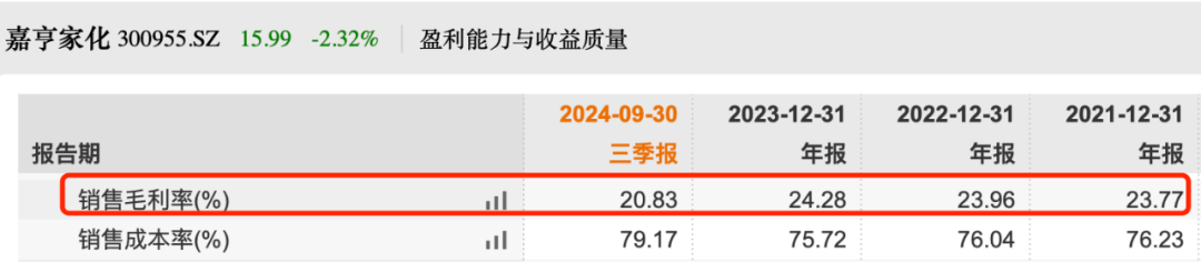 上述同期,嘉亨家化的销售毛利率在20%左右,2023年达到24.28%,同样高于青松股份的毛利率水平。