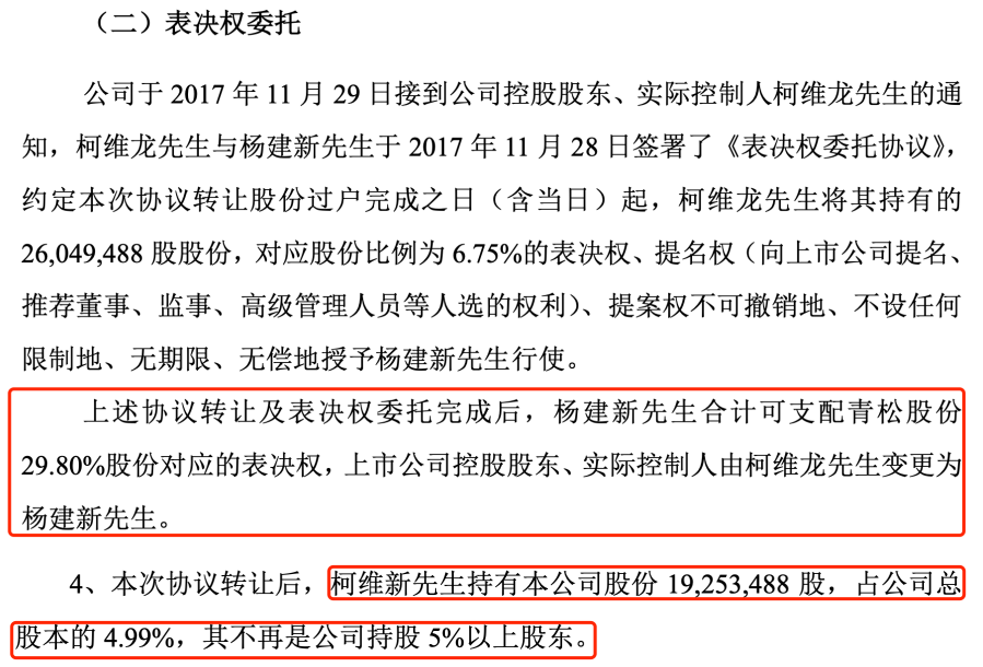2017年11月,青松股份宣布,柯维龙及其一致行动人通过协议转让及表决权委托的方式将公司控制权转移给杨建新。