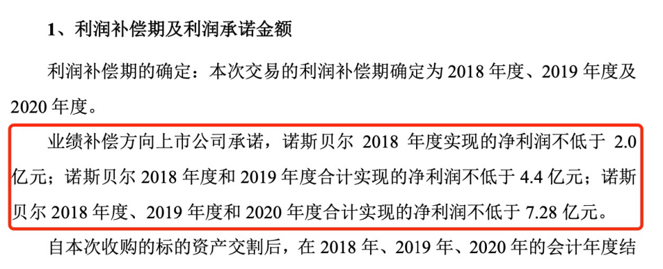 不过,诺斯贝尔与青松股份签署了利润补偿协议。按照规定,诺斯贝尔2018年至2020年合计实现的净利润需要不低于7.28亿元。