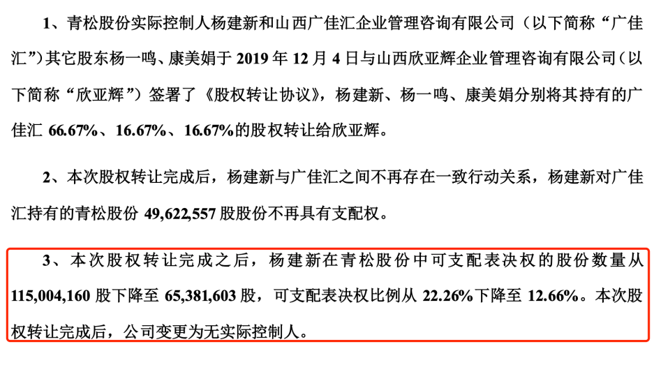 2019年12月,杨建新家族将持有的山西广佳汇大部分股权转让给欣亚辉。转让完成后,杨建新对于青松股份的可支配表决权比例从22.26%下降至12.66%,公司变更为无实控人。