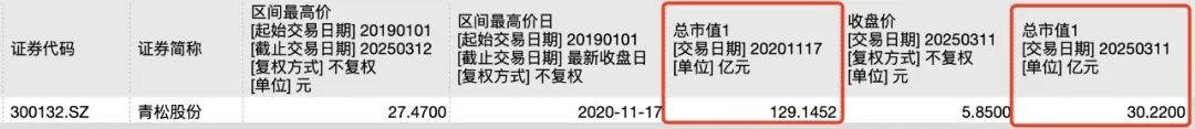 业绩终于等到回暖,但是公司的市值已经大不如前。2019年1月1日,也就是青松股份收购诺斯贝尔后,公司的股价最高点在2020年11月17日,市值达到129亿元。截至2025年3月11日,青松股份收盘价为5.85元/股,市值30亿元,缩水了近百亿元。