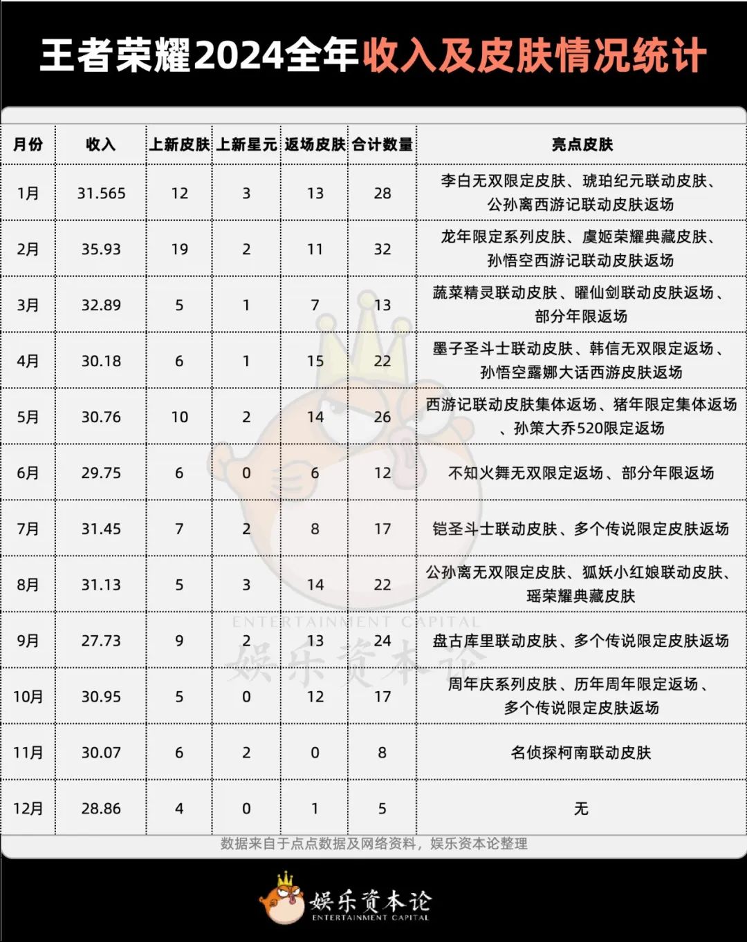 王者荣耀2024全年收入及皮肤情况统计