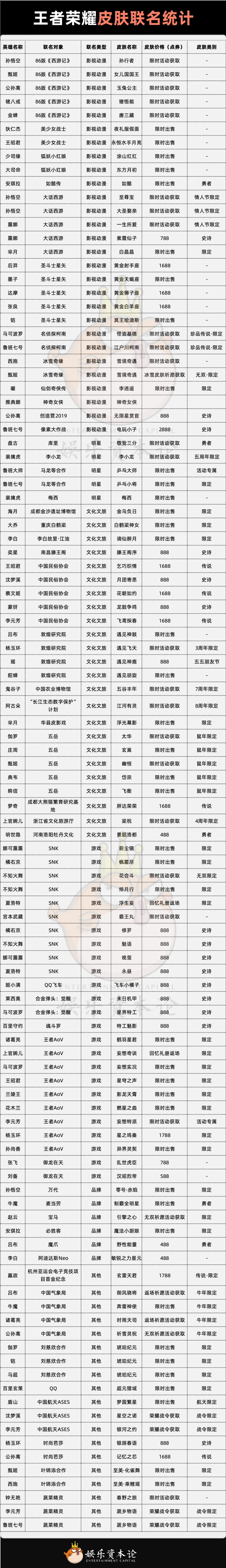 王者荣耀皮肤联名统计