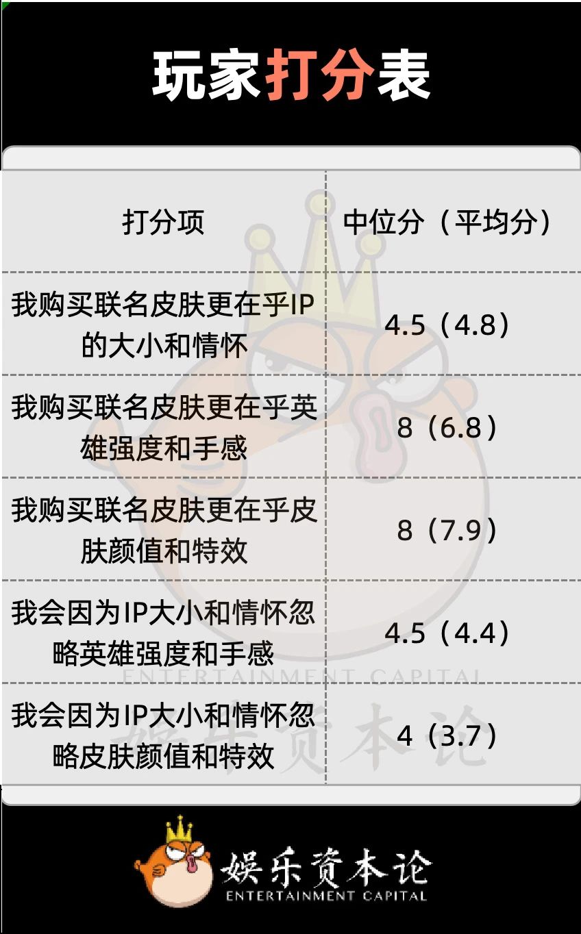 虽然大多数的英雄都是免费获取的,但从玩家打分来看,更多玩家并没有那么在乎联动IP,皮肤颜值特效、英雄强度手感、IP大小情怀三级连降。IP联动带来的流量红利是玩家付费的前提原因,但不计其数的“短命”皮肤证明,皮肤的整体销量似乎和IP大小、情怀深浅没有直接关系。