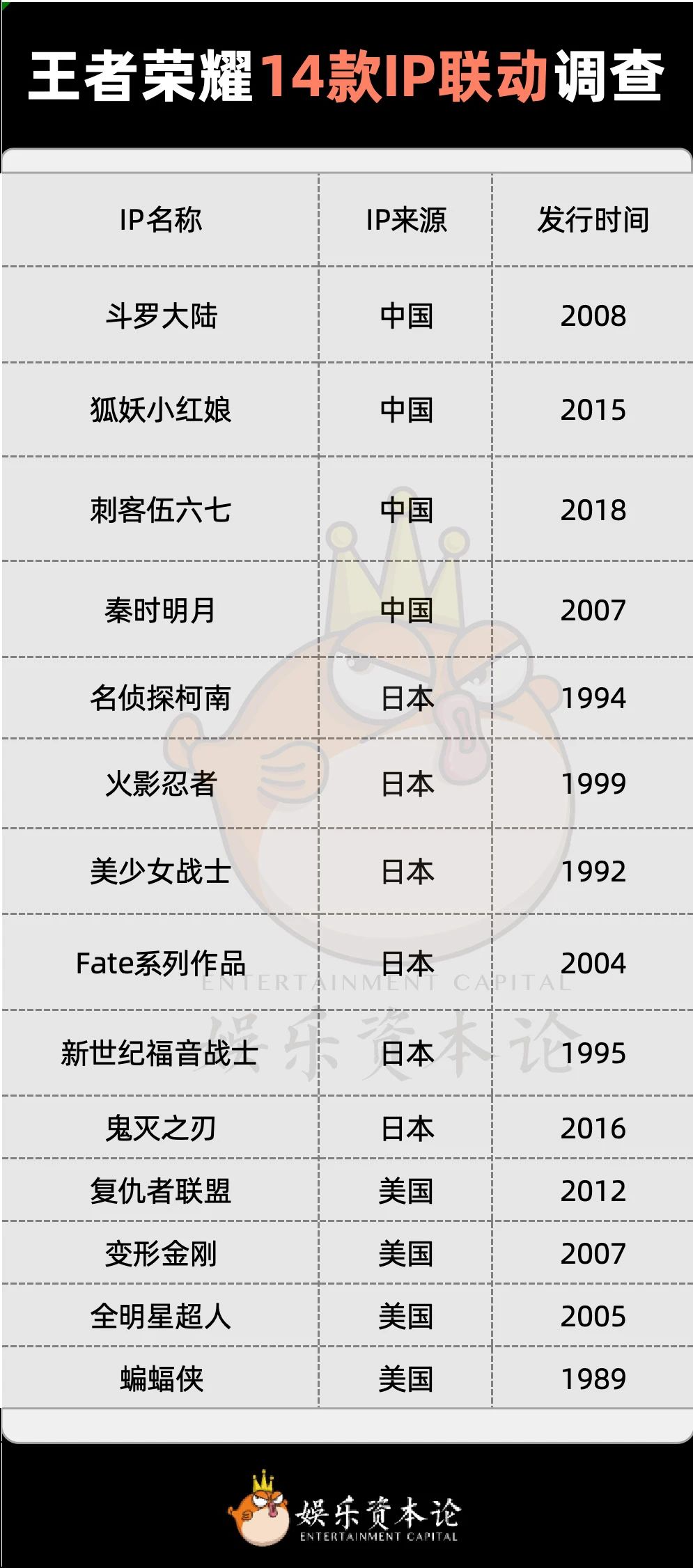 柯南联动后不久,王者新赛季官宣14款IP联动计划调查,14款IP围绕国漫、日漫和美漫经典IP展开,三丽鸥、百变小樱、美少女战士等6款日漫IP上榜。结合此前王者联动名侦探柯南、圣斗士星矢等案例,似乎可以看出王者的策略重心: