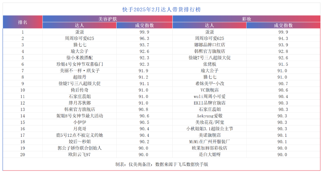 “快手一姐”蛋蛋,2月份一举斩获美容护肤类目和彩妆类目双第一。