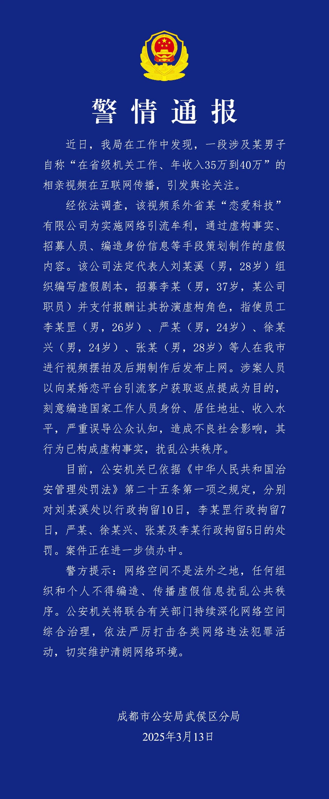 3月13日,成都市公安局武侯区分局通报,经依法调查,该视频系外省某“恋爱科技”有限公司为实施网络引流牟利,通过虚构事实、招募人员、编造身份信息等手段策划制作的虚假内容。该公司法定代表人刘某溪(男,28岁)组织编写虚假剧本,招募李某(男,37岁,某公司职员)并支付报酬让其扮演虚构角色,指使员工李某罡(男,26岁)、严某(男,24岁)、徐某兴(男,24岁)、张某(男,28岁)等人在成都市进行视频摆拍及后期制作后发布上网。涉案人员以向某婚恋平台引流客户获取返点提成为目的,刻意编造国家工作人员身份、居住地址、收入水平,严重误导公众认知,造成不良社会影响,其行为已构成虚构事实,扰乱公共秩序。