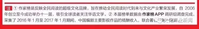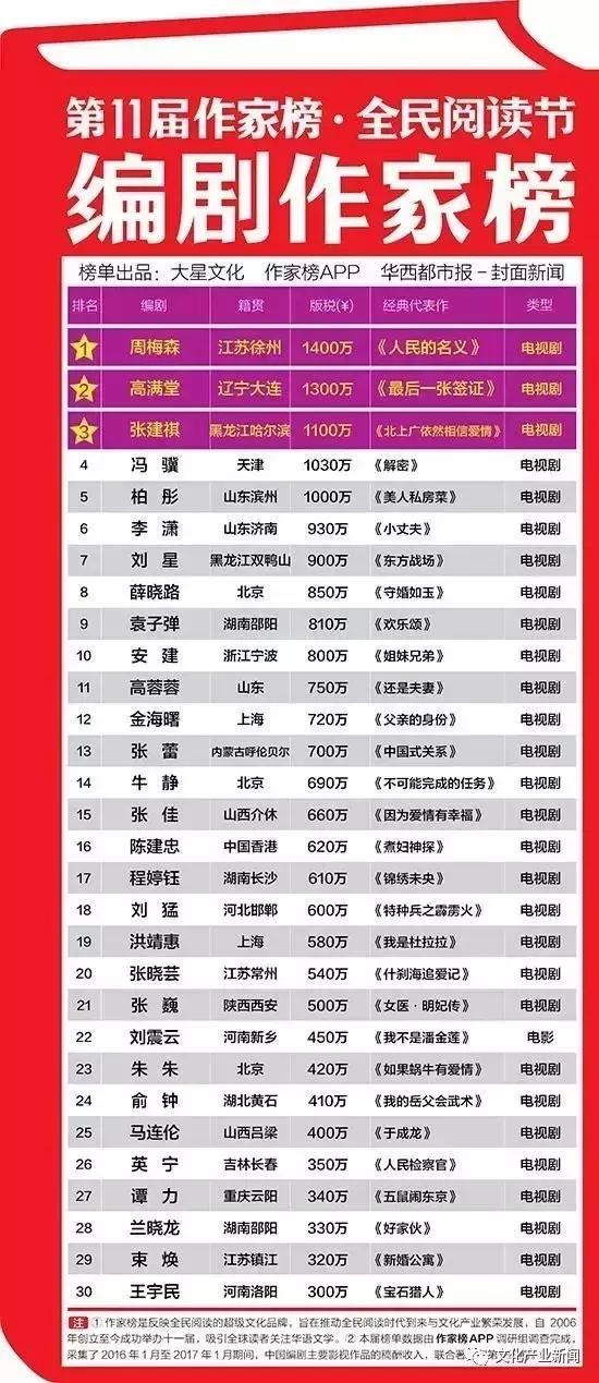昨日一大早,一个重磅新闻,爆炸在朋友圈里,引发众多业内人士热议。传说“第11届作家榜震撼发布!‘达康书记’闯进作家榜,《人民的名义》编剧吸金1400万!白岩松蝉联明星作家榜首富,孙悟空位居第七!”