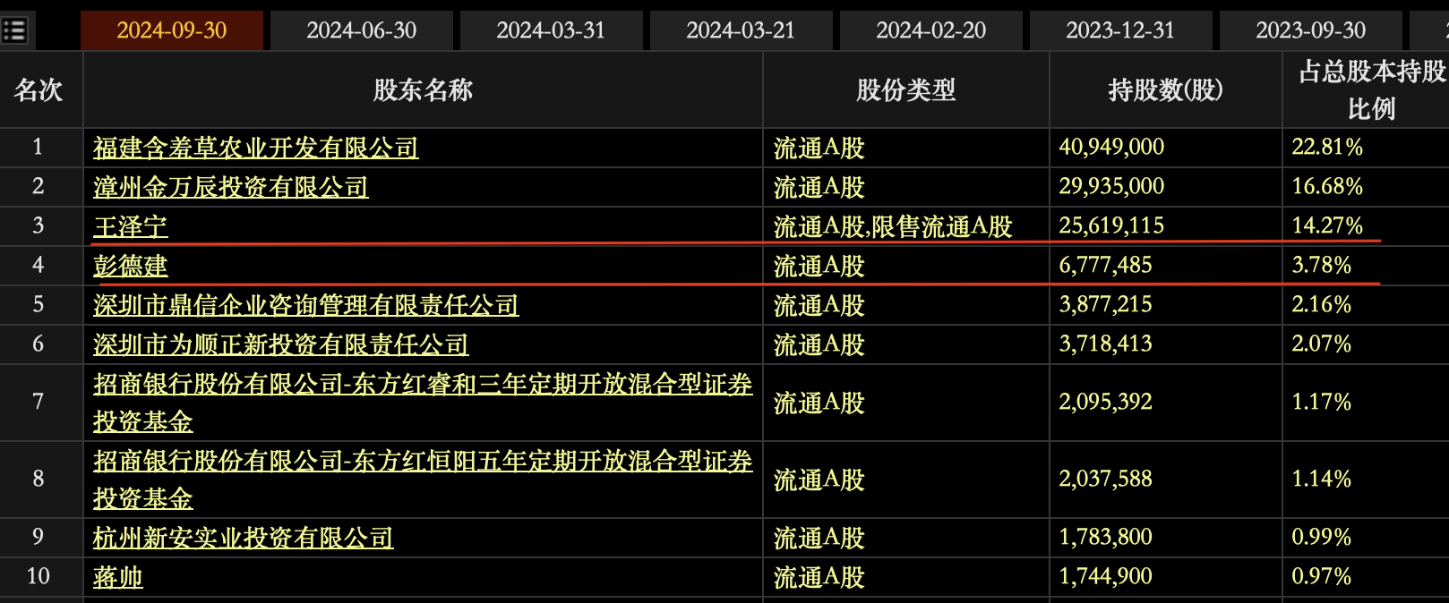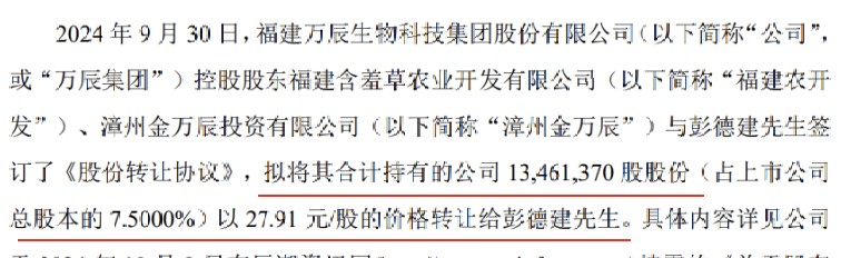 又过了两个月,万辰集团2024年10月22日公告,王泽宁实控公司“福建农开发”、“漳州金万辰”以每股28元的价格向彭德建转让1346万股万辰集团股份,总计约3.7亿元。