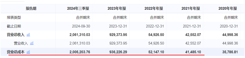 据年报显示,2022年万辰集团营业成本总和为只有5亿元左右,但2023、2024年该数值激增至约94亿元、300亿元左右。