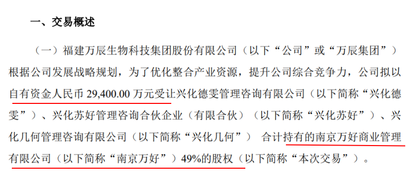 不到半年,万辰集团2024年8月15日公告,万辰集团以近3亿元的价格受让旗下孙公司南京万好49%的股权,所收购的股权90%来自好想来创始人彭德建。