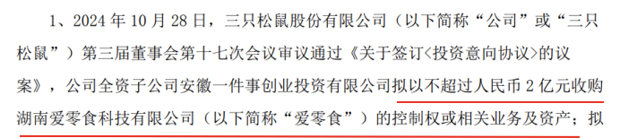2024年10月,三只松鼠宣布收购“爱零食”,该公司是一家量贩零食品牌,控股了成都本地连锁零食品牌“恐龙和泰迪”、贵州量贩零食品牌“胡卫红”、陕西零食品牌“零食泡泡”。