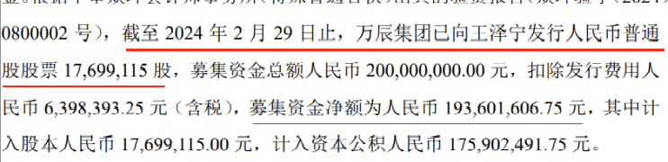 万辰集团2024年3月6日公告:万辰集团向王泽宁(王健坤之子)定增1770万股,募资近2亿元。