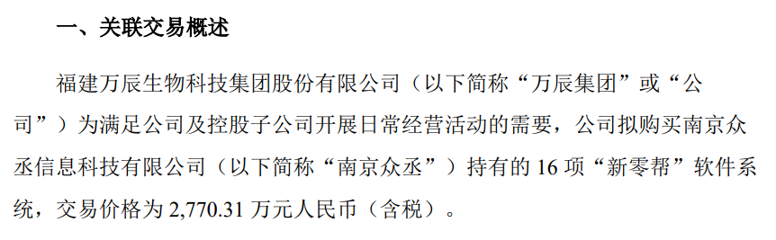 就在2024年12月,万辰集团公布了一则公告,称拟花费2700多万元购买软件系统,而被购买方实控人正是彭德建。
