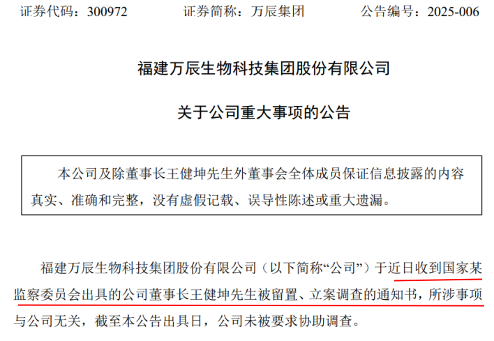 3月3日,一则公告将万辰集团(300972.SZ)推向舆论风口,公告称,近日公司董事长王健坤被留置、立案调查。