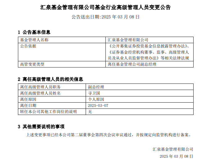 根据汇泉基金公告,寻卫国因个人原因于3月7日离任。值得注意的是,寻卫国刚在1月末从督察长转任公司副总经理。也就是说,在副总经理的位置上不足2个月,寻卫国便匆匆离任。