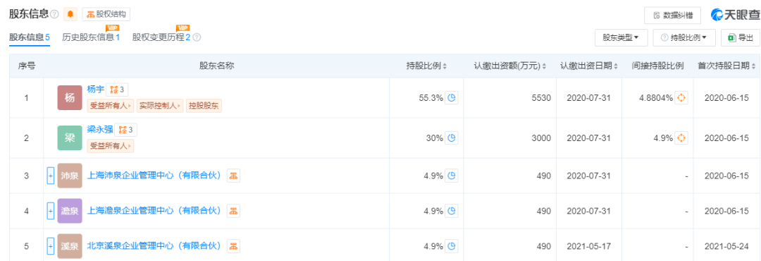 从持股结构看,该公司是一家“个人系”公募,由杨宇、梁永强分别持股55.3%、30%,上海沛泉企业管理中心(有限合伙)、上海澹泉企业管理中心(有限合伙)、北京溪泉企业管理中心(有限合伙)分别持股4.9%。