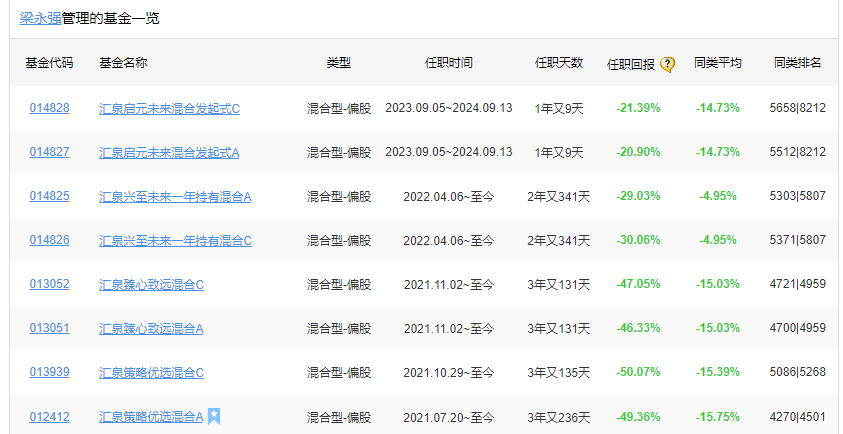 不过曾经的“顶流”,如今在管产品也陷入到困境。截至目前,梁永强管理的8只产品任职收益全部为负,在同类排名中也均处于尾部。
