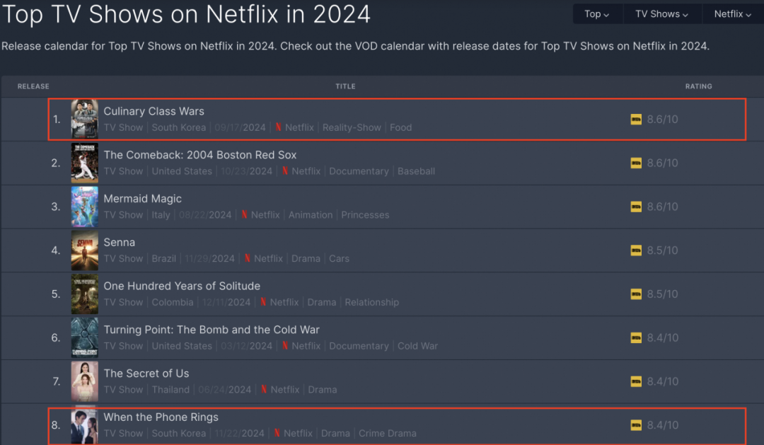 再来看看流媒体老大哥Netflix。2024年在Netflix播出的约60档真人秀节目中,只有10档为明星综艺。而在一众素人综艺当中,像《黑白厨师:料理阶级战争》《爱情盲选》《体能之巅》《圆环》等则在全球热播,排名甚至超过了像《现在拨打的电话》这种热门电视剧。
