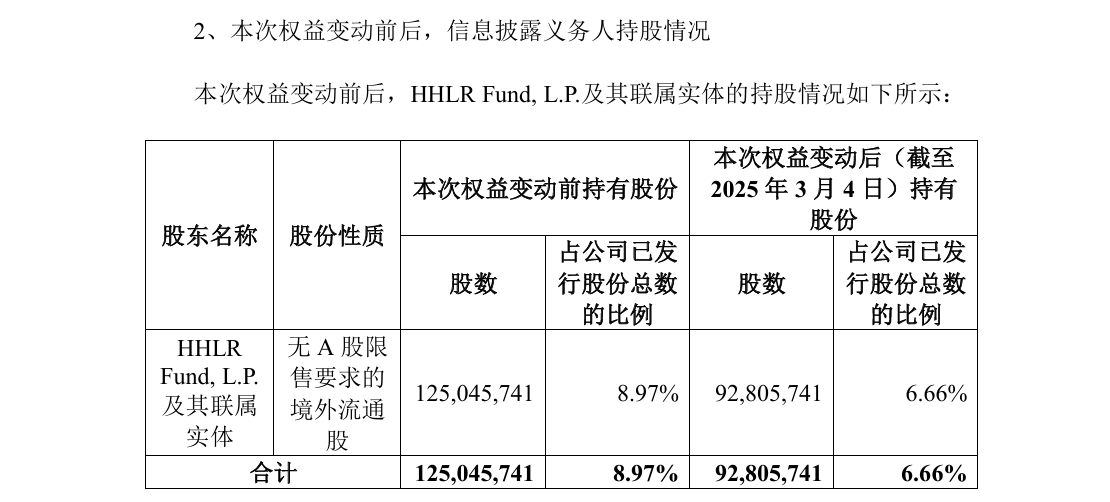 然而,当百济神州市值攀升之际,股东高瓴资本已多次减持套现。3月6日,H股百济神州发布公告称,2025年3月3日至3月4日,高瓴旗下的HHLR Fund等通过大宗交易方式减持百济神州境外流通股3224万股,此次套现约50亿港元。减持完成后,其持股比例从8.97%下滑至6.66%。