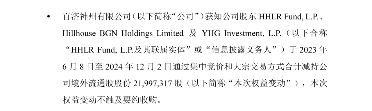 实际上,2023年6月8日至2024年12月2日,高瓴便通过集中竞价和大宗交易方式合计减持百济神州境外流通股股份2199.7万股,若按照111港元/股的平均持股价计算,减持套现约24亿港元。
