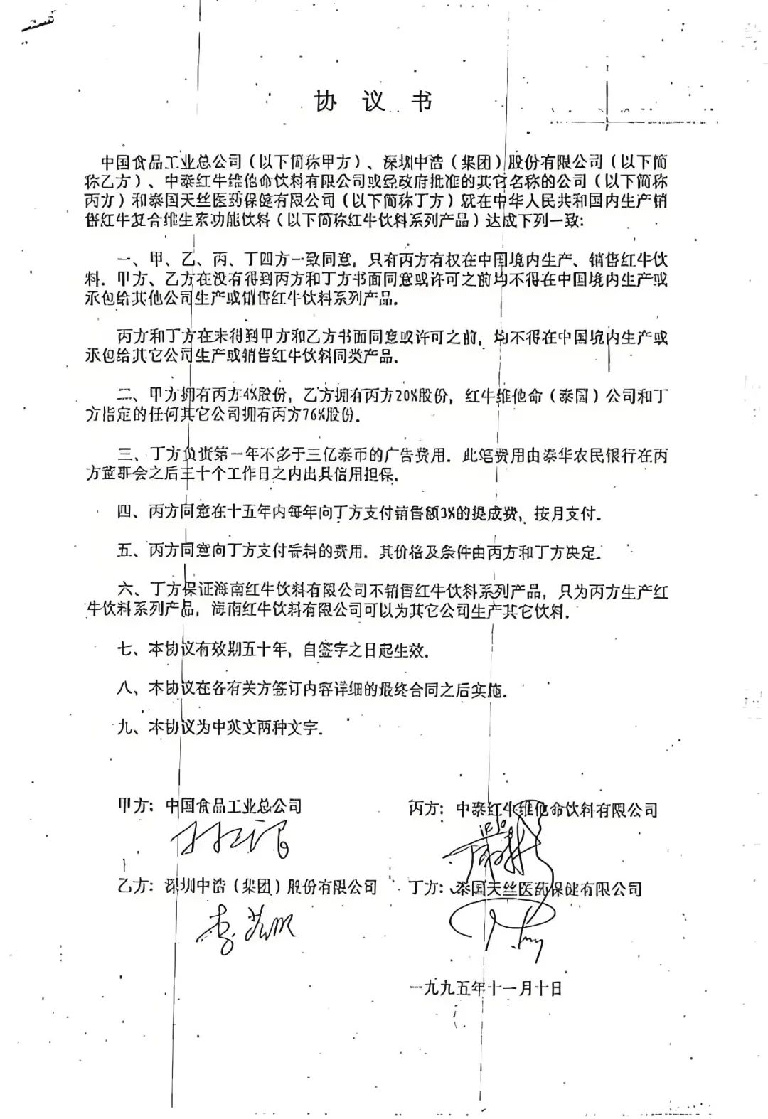 万余字的声明中,泰国天丝贴出了“50年协议”复印件,称这是一份由四方签署、共九条内容的协议书,但是四方中的一家——中泰红牛维他命饮料有限公司自始未设立。“协议书”均未加盖企业公章。