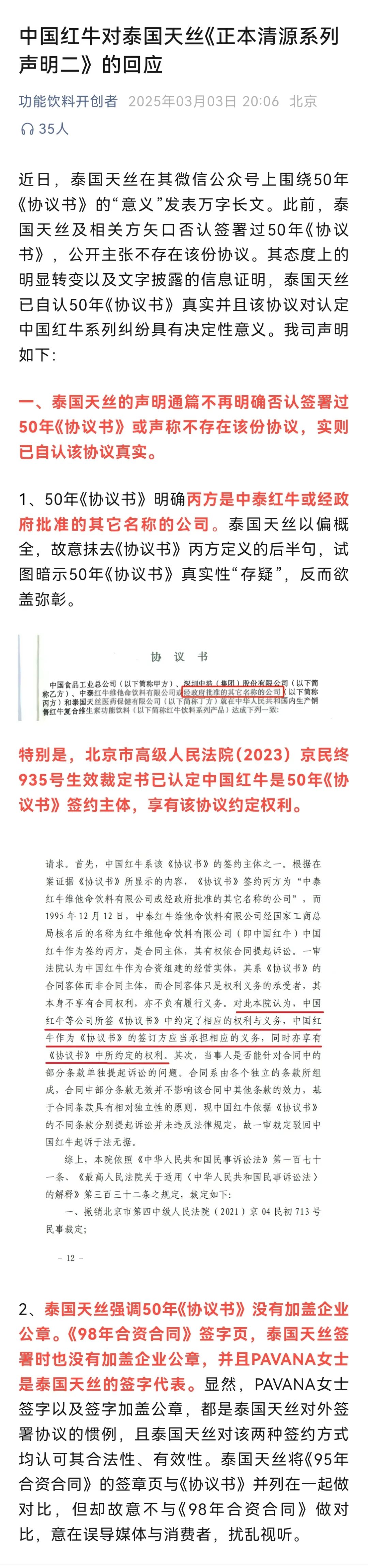 3月3日,针对泰国天丝的最新声明,中国红牛进一步提到,泰国天丝的声明通篇不再明确否认签署过“50年协议书”或声称不存在该份协议,实则已自认该协议真实。