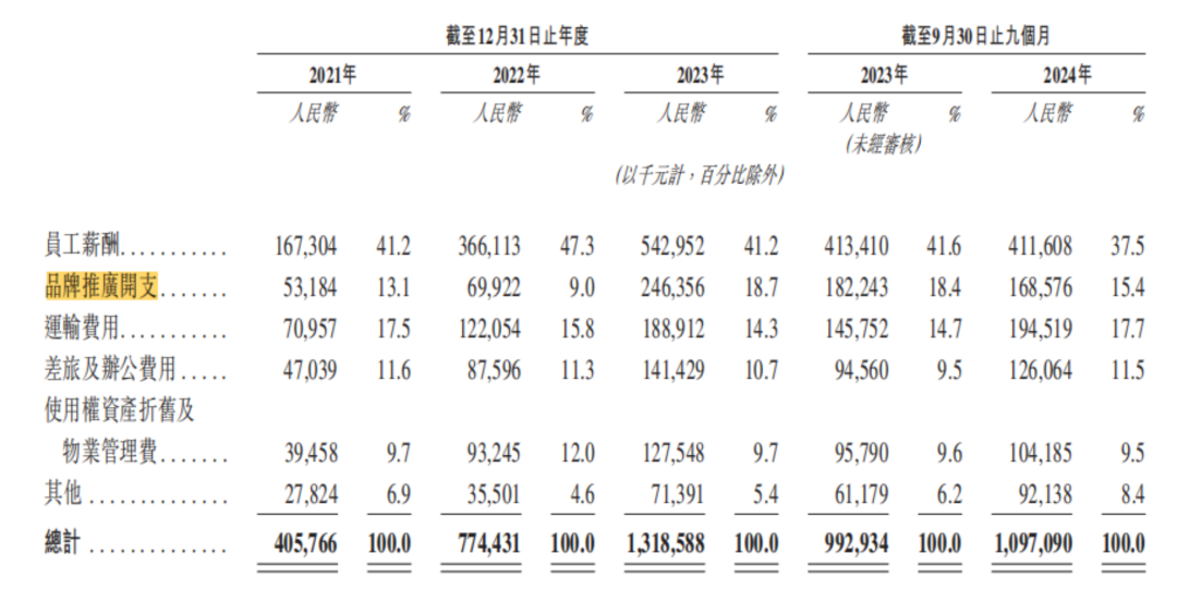 也就是自2023年开始,蜜雪冰城财务数据中“品牌推广开支”成本激增,2023年全年的这一开支达到2.46亿元,同比大幅增长252%,2024年前9个月的品牌推广开支为1.69亿元。这意味着从2023年起,21个月内,蜜雪冰城花掉了超过4.1亿元做自身品牌的营销推广。