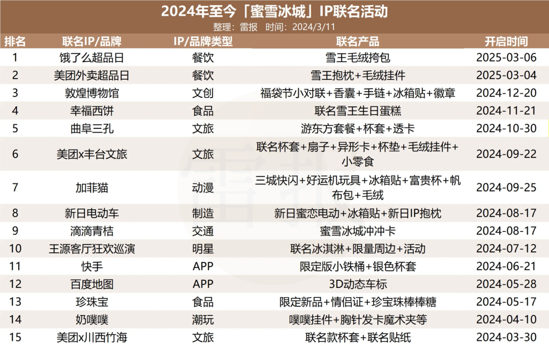 跨界联名方面,雷报统计了2024年至今,蜜雪冰城的IP联名活动(人工统计存在误差),发现24年以来,雪王已跨界合作了至少15个IP或品牌,覆盖潮玩、文创、食品、文旅、动漫、明星等多元化的IP类型,联名产品除了挎包、抱枕、毛毯等生活好物,也包括毛绒、透卡、挂件、徽章等一系列“谷子”周边。
