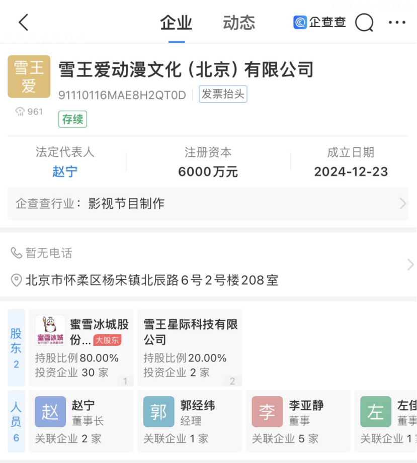 蜜雪冰城还有打造“雪王宇宙”的野心。IP内容方面,继2023年首部动画《雪王驾到》播放量超2.1亿次后,2024年12月21日,续作《雪王之奇幻沙洲》进一步拓展了雪王IP世界观。紧接着,12月23日,雪王爱动漫文化(北京)有限公司正式成立,注册资本6000万元,企查查显示,雪王爱动漫由蜜雪冰城持股80%,蜜雪冰城全资子公司雪王星际科技有限公司持股20%。据悉,该公司计划推出“雪王大电影”,并探索动画电影与品牌联动的商业模式。