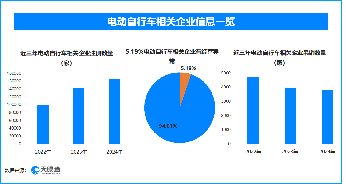 天眼查天眼风险显示,从事电动自行车相关的业务企业中,2.66%的相关企业曾出现法律诉讼,5.19%的相关企业曾出现经营异常,1.71%的相关企业曾出现行政处罚。与此同时,2024年电动自行车相关企业共产生3799家被吊销事件。