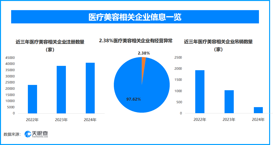天眼查天眼风险显示,从事医疗美容相关的业务企业中,2.37%的相关企业曾出现法律诉讼,2.38%的相关企业曾出现经营异常,2.43%的相关企业曾出现行政处罚。