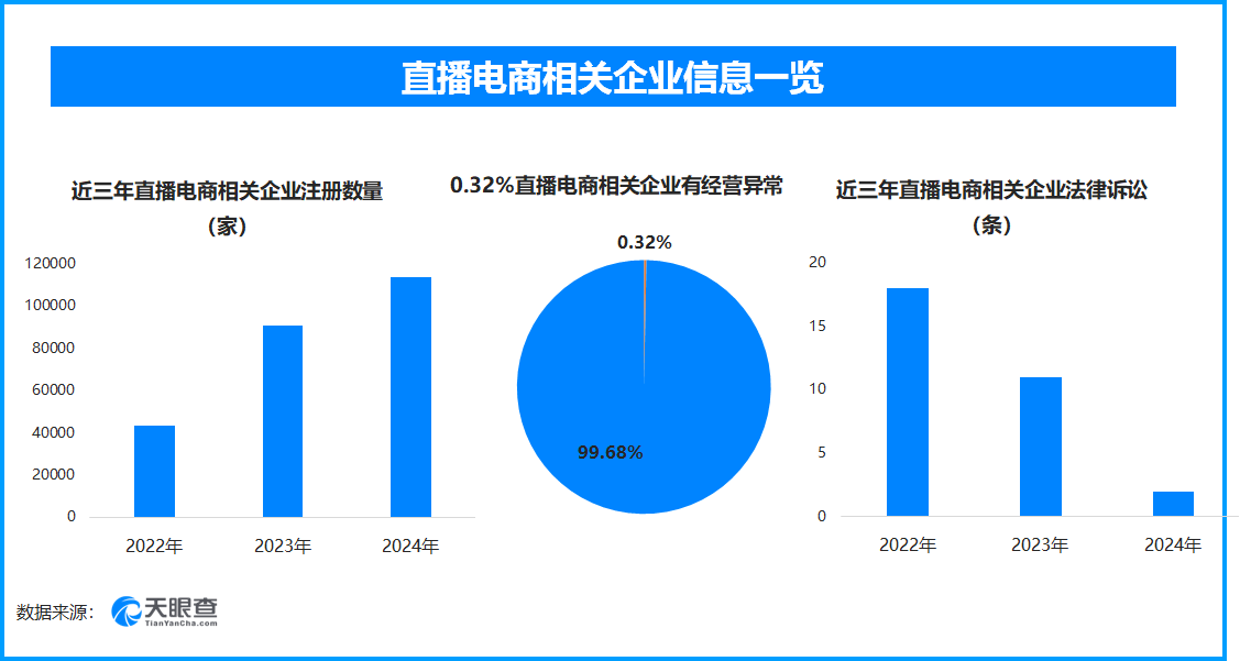 天眼查天眼风险显示,从事直播电商相关的业务企业中,0.89%的相关企业曾出现法律诉讼,0.32%的相关企业曾出现经营异常,0.36%的相关企业曾出现行政处罚。据天眼查司法案件数据显示,涉及不正当竞争纠纷的案件占比为16.67%,买卖合同纠纷的案件占比为10%。